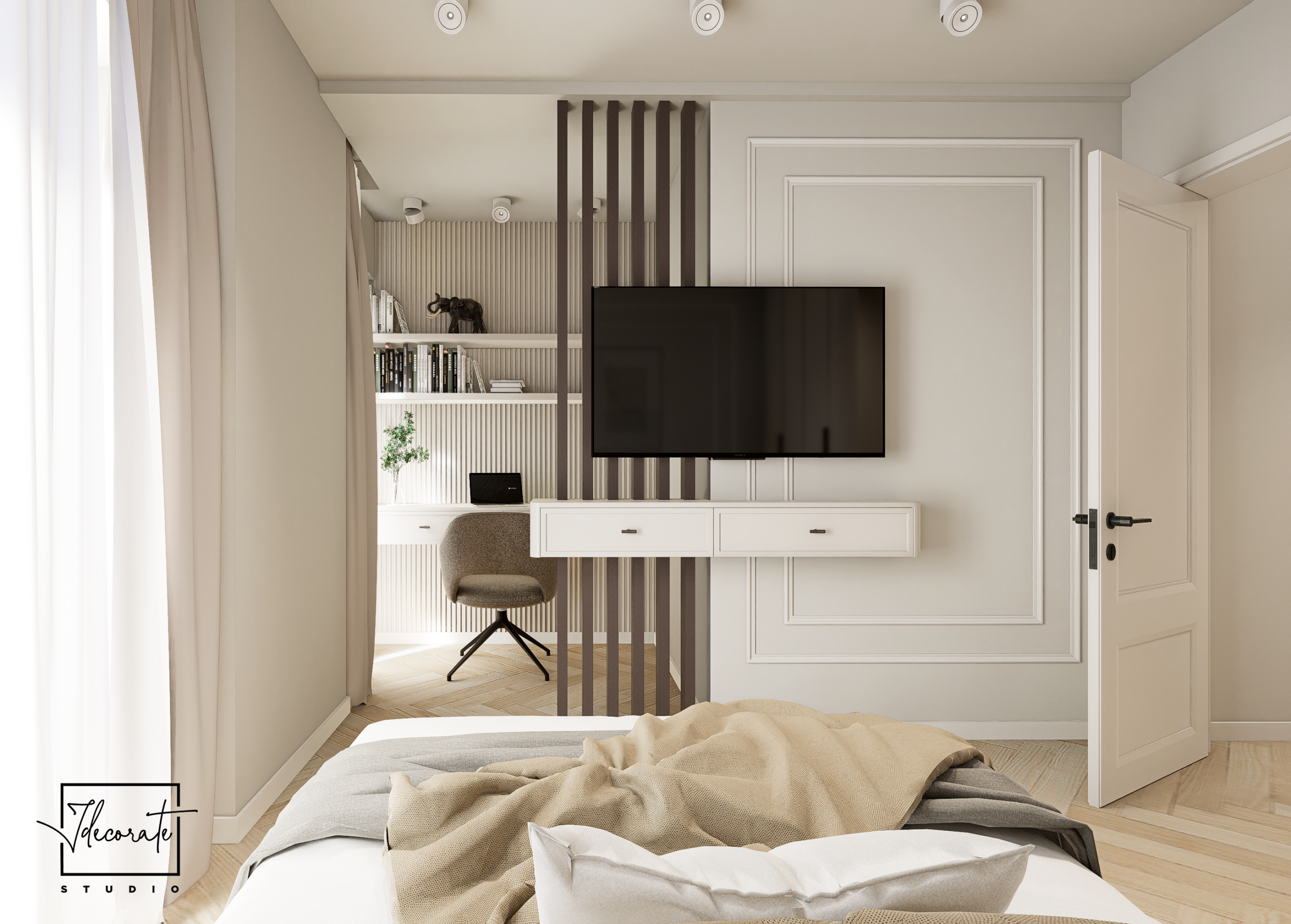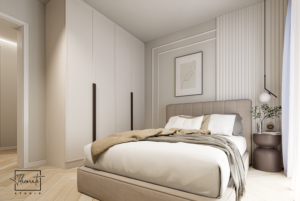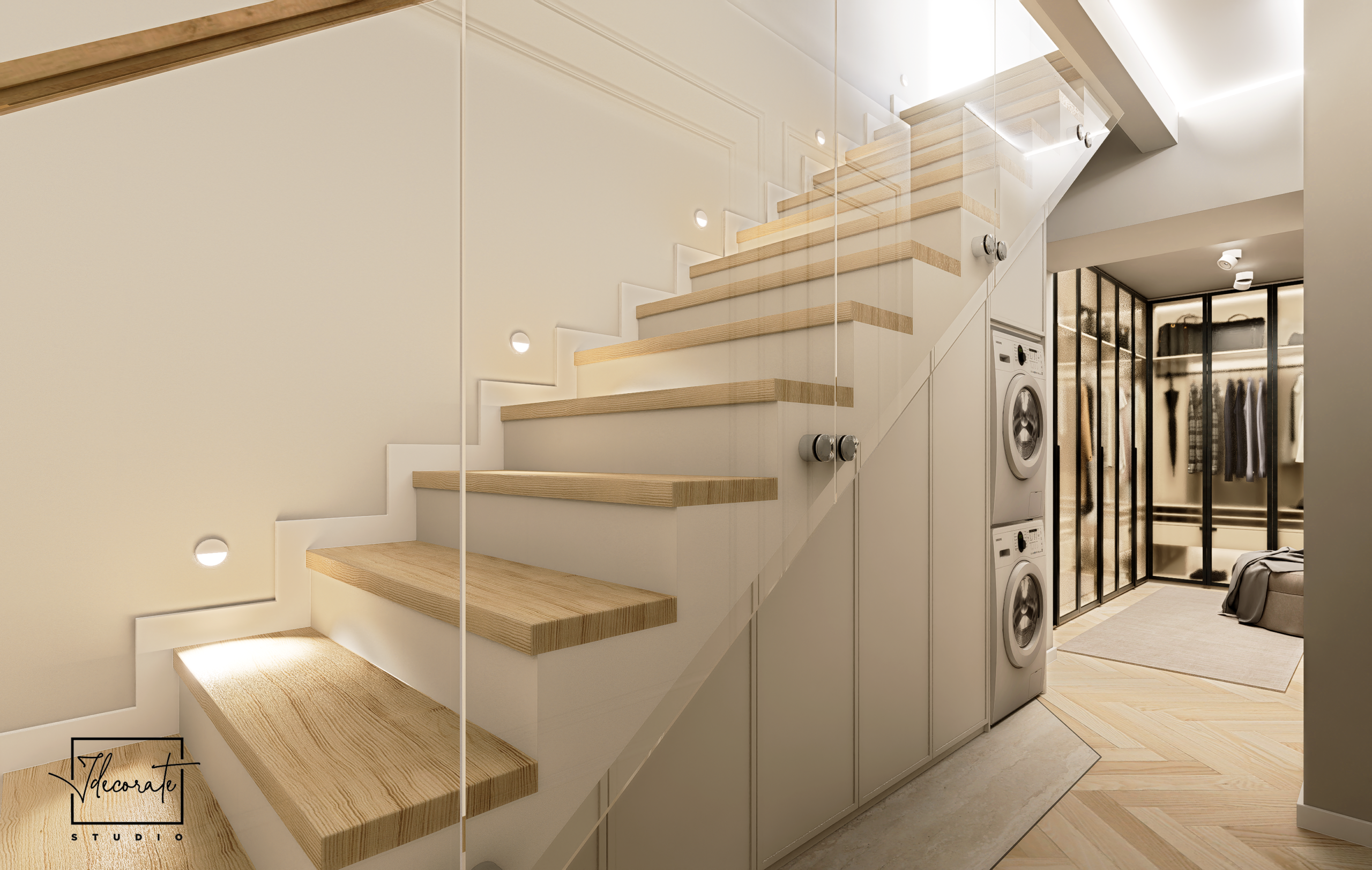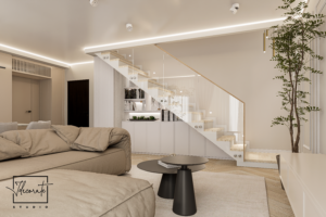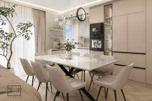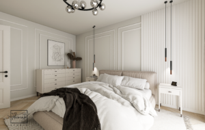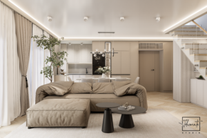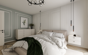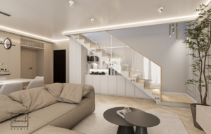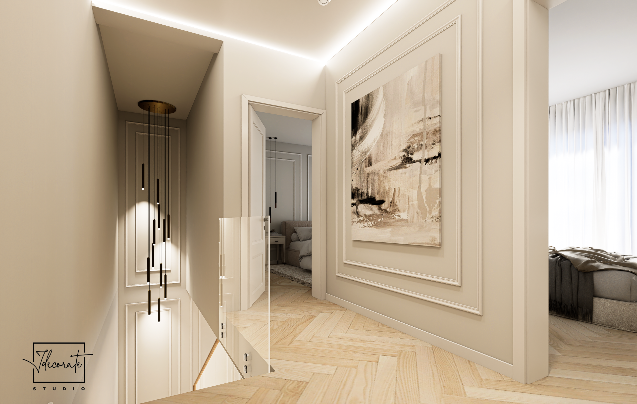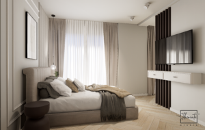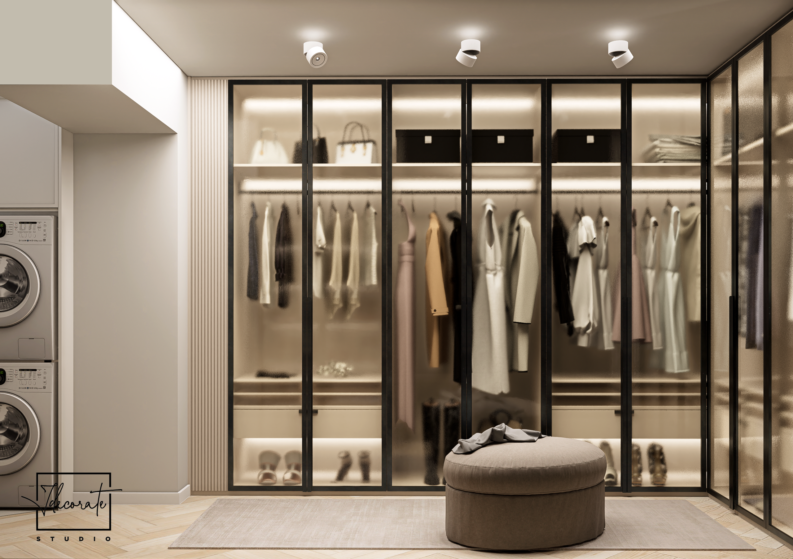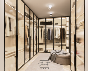 În acest proiect, fiecare element a fost selectat și plasat atent pentru a putea oferi un nivel înalt de confort utilizatorilor din toate punctele de vedere. Din perspectivă estetică, spațiului i-a fost atribuit o îmbinare cromatică simplă, în special de nuanțe neutre deschise, menite să mărească vizual încăperile și să le ofere o luminozitate aparte. În completarea acestui aspect, intervin sistemele de iluminare ambientală, alese de așa manieră încât să îmbunătățească spațiul funcțional, dar și estetic, evidențiind anumite elemente de design prin poziția, modul de iluminare și intensitatea lor. Vila a fost, de altfel, avantajată ergonomic întrucât fiecare obiect de mobilier sau ornament a fost așezat în așa fel încât să nu îngrădească spațiul. Plantele au rolul de a evita transmiterea unui aer monoton, oferind prospețime și vitalitate spațiului. Dressingul este o încăpere-cheie a acestei vile, prin modul autentic în care a fost realizat. Acesta este spațios și bine iluminat, oferind o experiență excelentă în ceea ce privește procesul decizional al alegerii outfitului ideal.